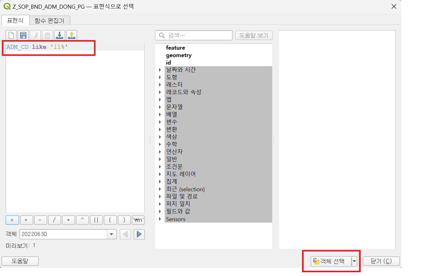 테이블을 계속 스크롤 해서 내려가면 감으로 알게 되는데, ADM_CD 값이 '11'로 시작하면 서울이란 뜻이다. 이제 ADM_CD 가 11로 시작하는 객체만 선택해야 한다. 위에 그림에 빨간 동그라미가 '표현식을 이용해 객체 선택'이란 건데 클릭하면 창이 하나 뜨고 거기에 표현식을 아래와 같이 쓰고(그냥 외워) 객체 선택을 누르면 서울의 행정동만 선택이 된다.