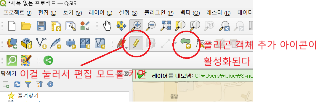 '확인' 누르면 레이어 창에 내가 만든 파일 이름으로 새 레이어가 생성된 것을 볼 수 있는데, 아이콘 메뉴에서 연필 모양을 클릭해서 편집 모드를 켜고, 오른쪽에 '폴리곤 객체 추가' 아이콘을 클릭한 뒤 지도에서 원하는 사각형을 그리면 된다.