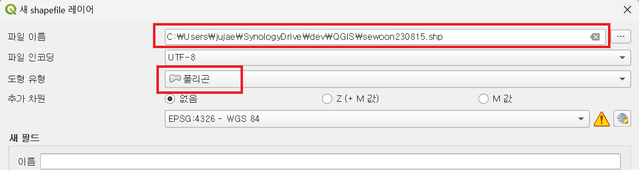 이제 우리의 구역으로 가 보자. 지도에서 충무로~종로3가까지의 구역을 확대해 놓고 다각형을 그려야 한다. 풀다운 메뉴에서 레이어(L) > 레이어 생성 > 새 Shapefile 레이어... 선택. 파일 이름은 적당히 하고 도형 유형은 '폴리곤'으로 한다.