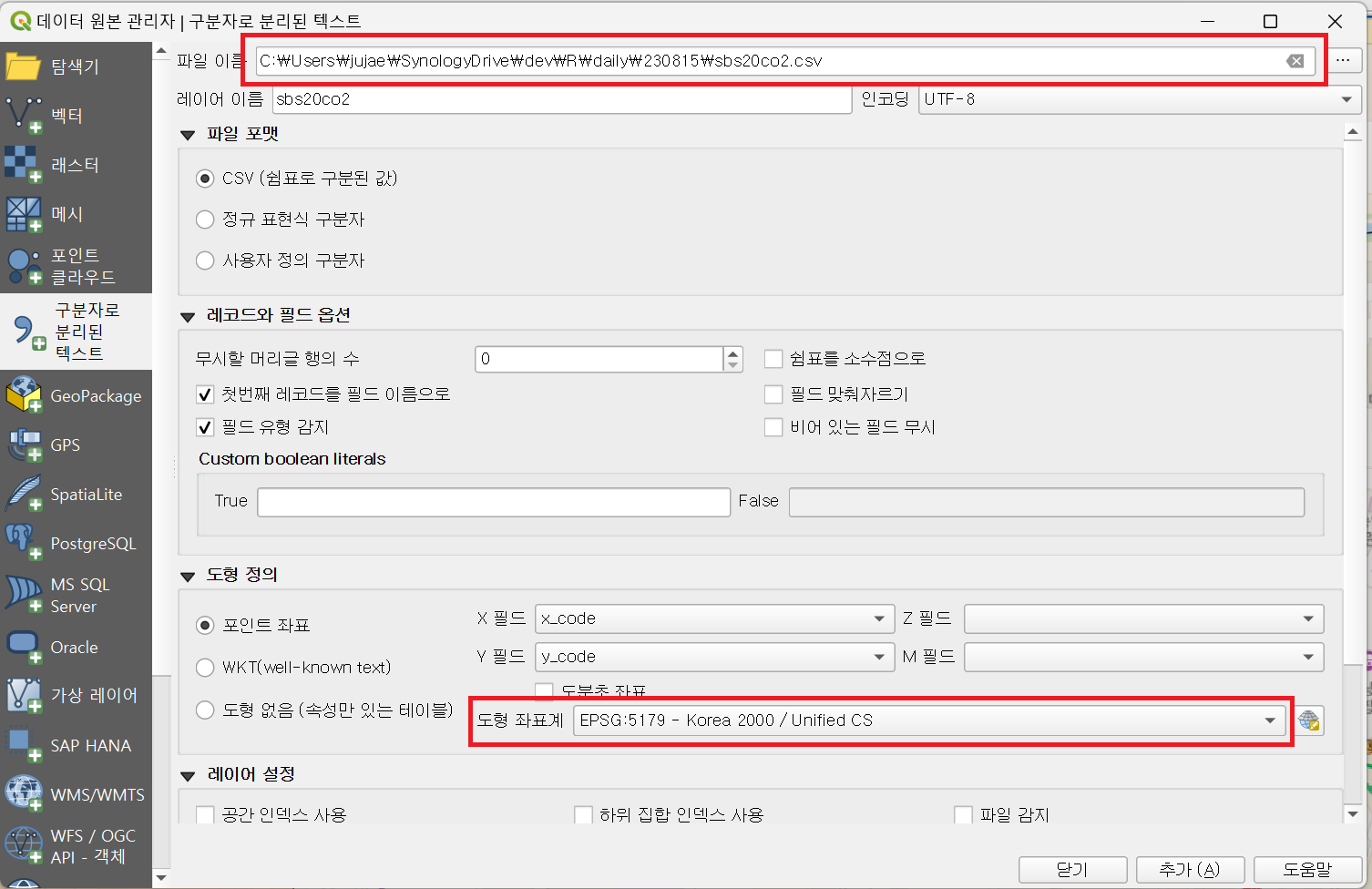 자 이제 처음 R에서 저장했던 사업체조사 .csv 파일을 불러올 차례다. 이 파일은 x_code, y_code란 이름의 변수로 좌표 값을 가지고 있는데 QGIS에서 부르면 이 변수를 자동으로 좌표로 인식한다.