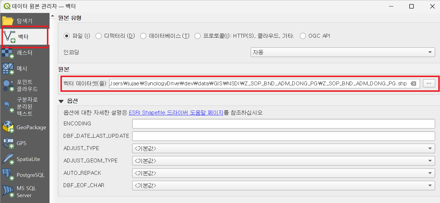 창이 뜨면 왼쪽 메뉴에서 '벡터'를 선택하고, 오른쪽 '원본'에서 방금 압축 푼 폴더에서 .shp 파일을 불러온 다음 추가(A)를 누르면 화면에 지도가 뜰 것이다.