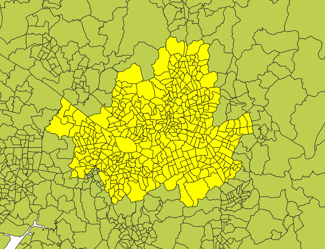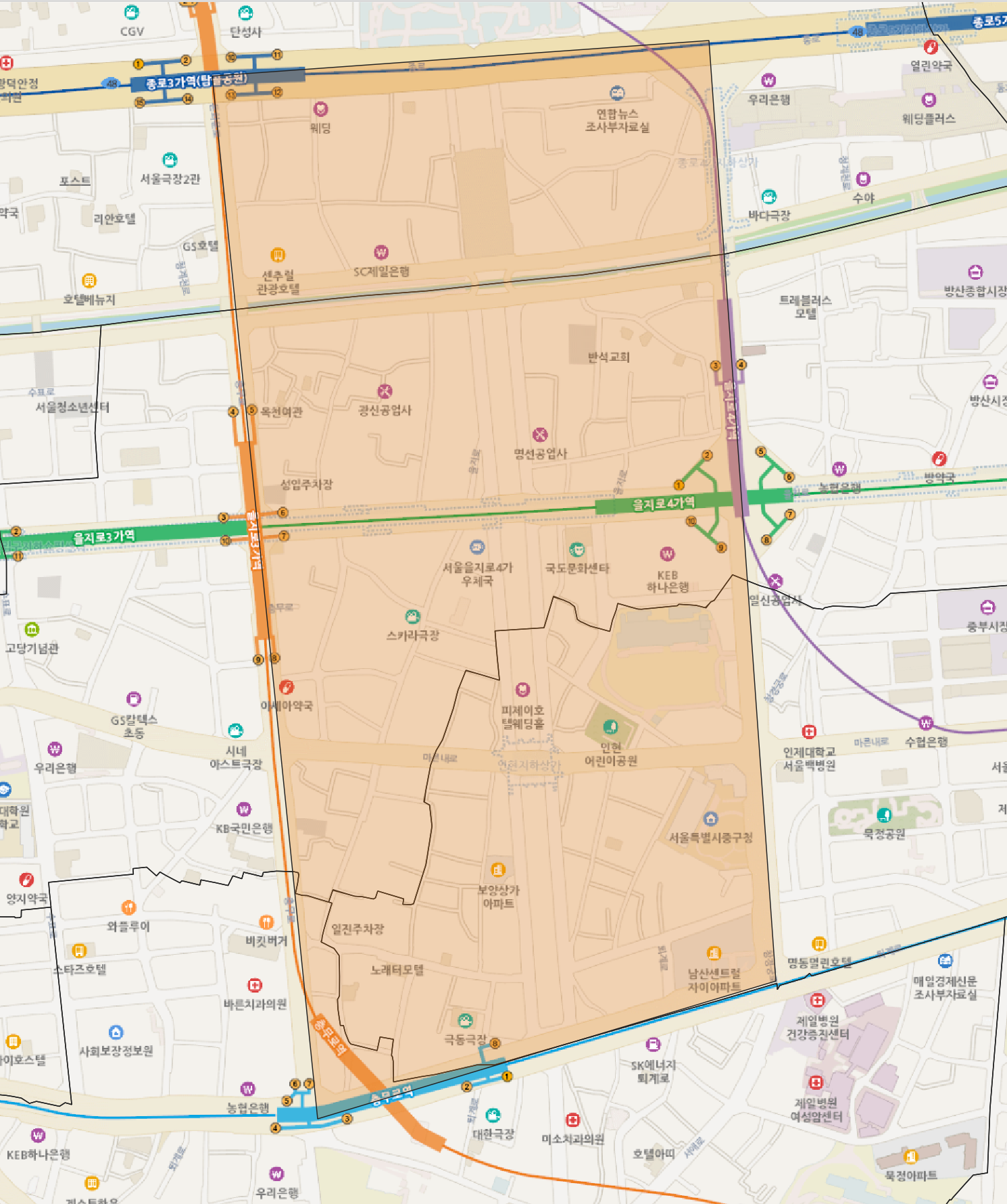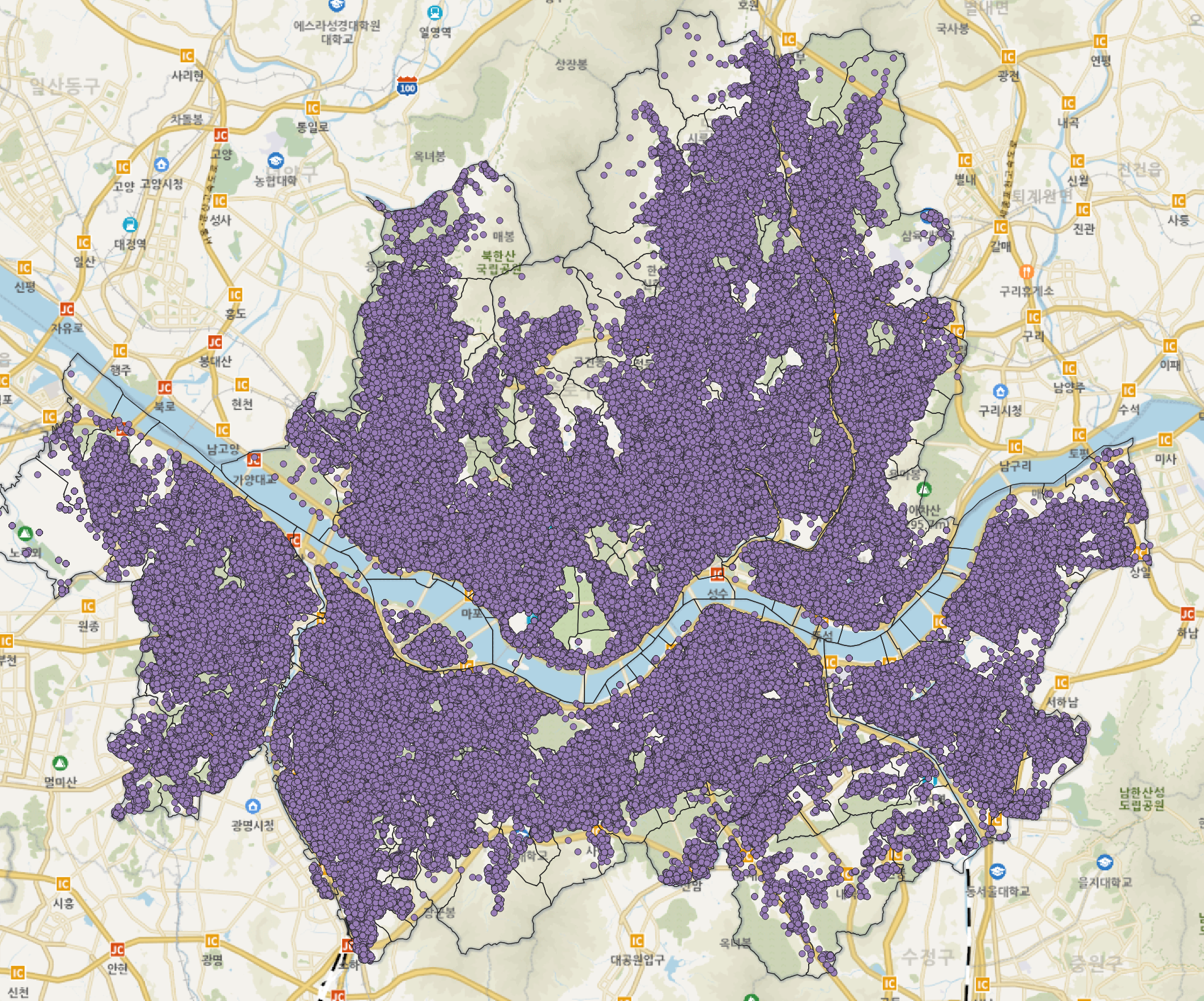 지도 화면을 잘 보면 서울만 노란색으로 변해 있는 걸 볼 수 있는데, 확대 버튼 누르고 서울 주변에 창을 그려서 서울만 확대 해서 보면 더 잘 볼 수 있다.