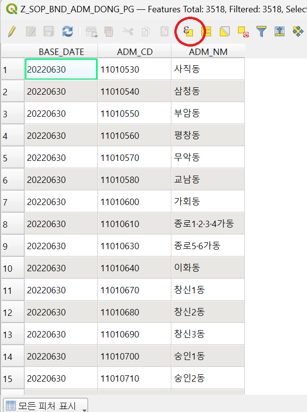지도를 보면 전국이 다 뜨는데, 일단 내가 필요한 것은 서울이기 때문에 이걸 이용해 서울만 따로 추출한 행정동 경계 지도를 만든다. QGIS 화면 왼쪽 하단에 레이어 창이 있는데 방금 불러온 레이어 이름을 우클릭하고 '속성 테이블 열기(A)'를 선택하면 다음과 같은 테이블이 보일 것이다.