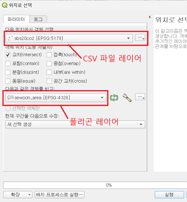그림에서 보는 것과 같이 포인트 레이어와 폴리곤 레이어를 각각 선택하고 실행 누르면 폴리곤 안에 있는 포인트만 선택이 된다. 폴리곤 안에 있는 포인트가 다른 색깔로 바뀐 것을 볼 수 있다.