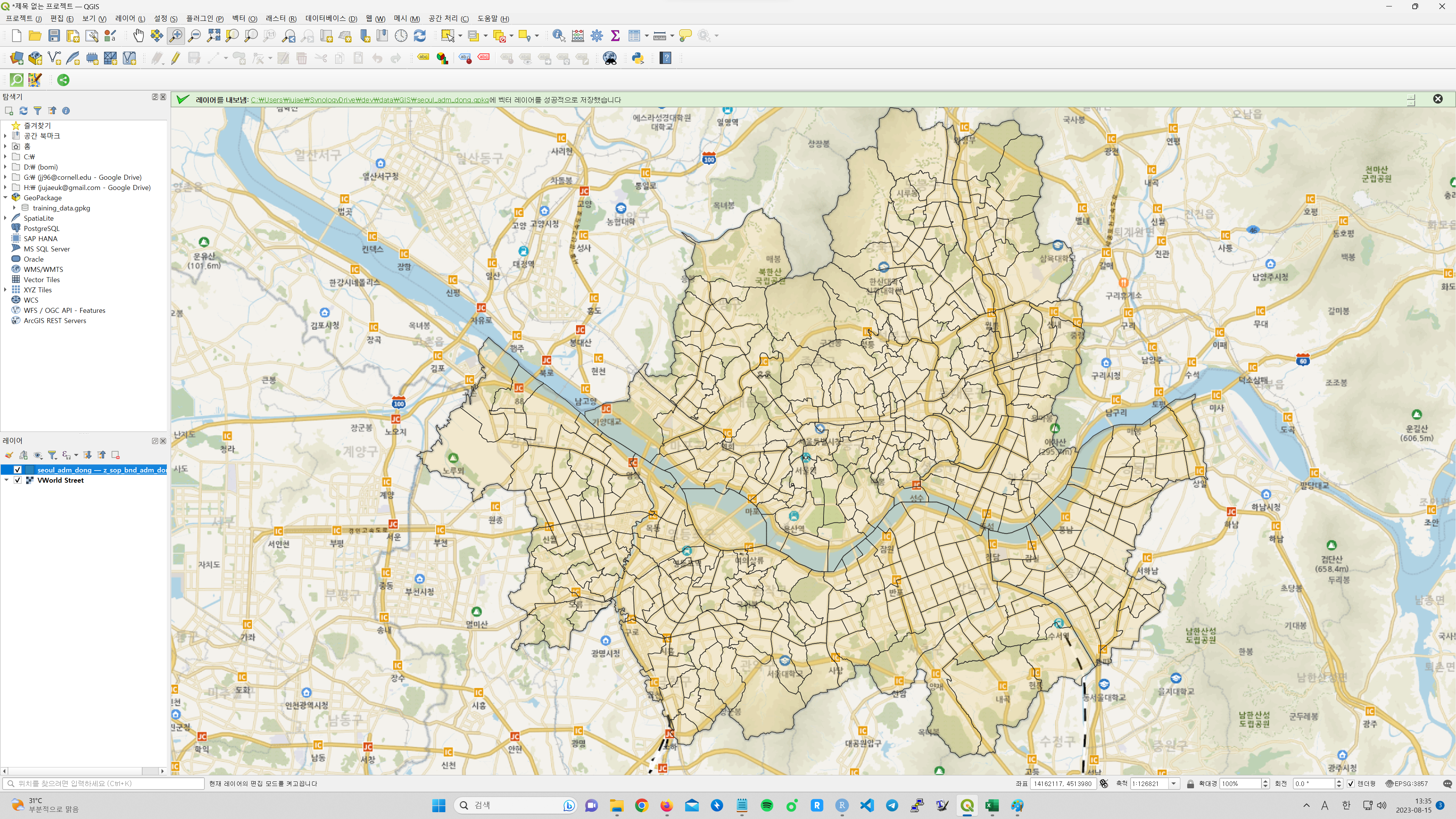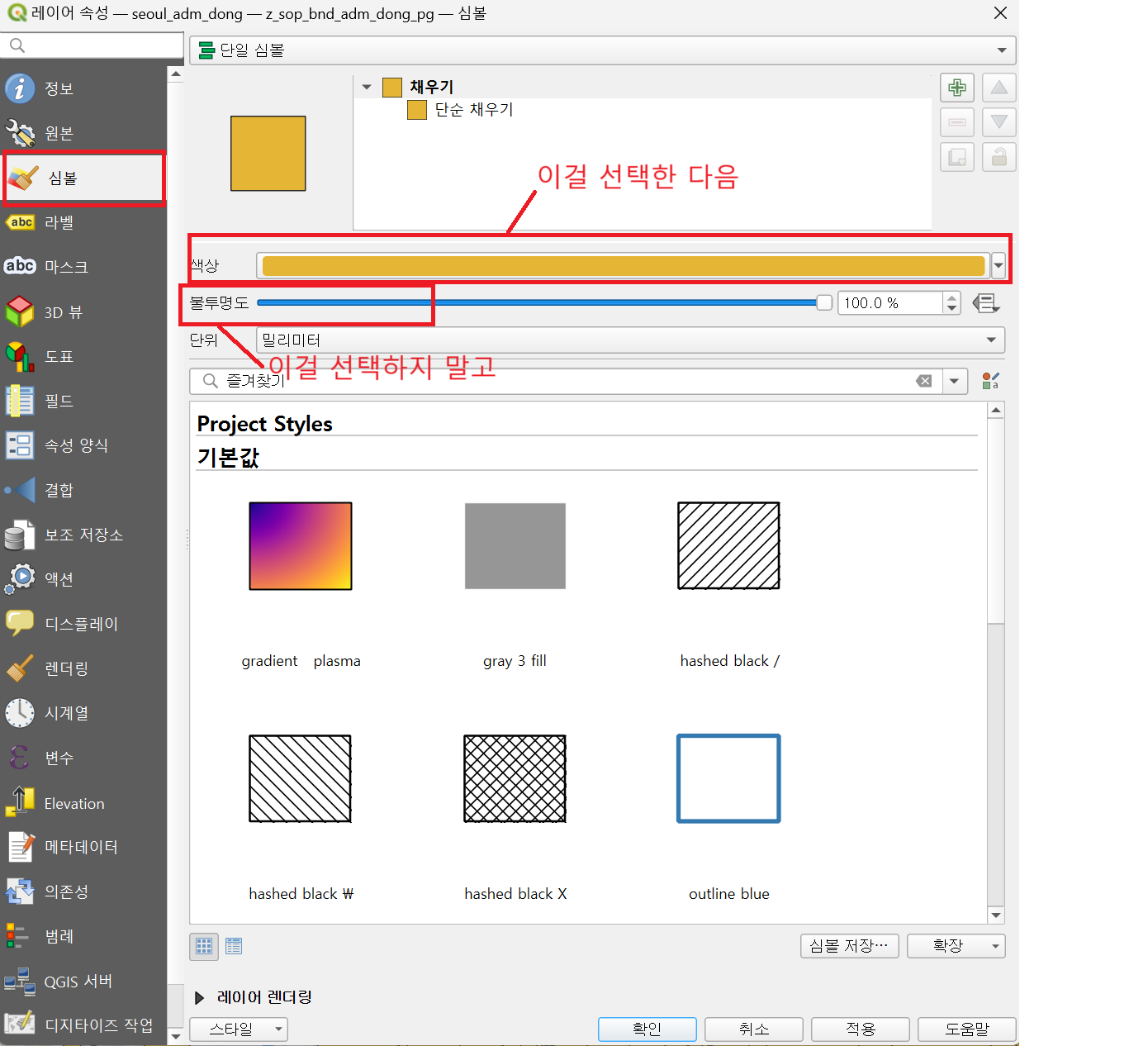 지도가 화면에 뜨면서 아까 내가 만들었던 레이어를 다 가린다. 레이어 창으로 가서 VWorld Street 레이어를 밑으로 끌어 당긴 다음에, 서울 행정동 레이어 우클릭 > 속성(P) 들어가서 창이 하나 뜨면 왼쪽에 심볼을 선택하고, 색상을 선택한 다음에 불투명도를 낮추면 지도랑 행정동 경계가 겹쳐서 보인다. (주의!!! 색상 바로 밑에 있는 불투명도를 낮추지 말고, 색상을 선택한 다음에 나오는 창에서 불투명도를 낮춰야 한다.)