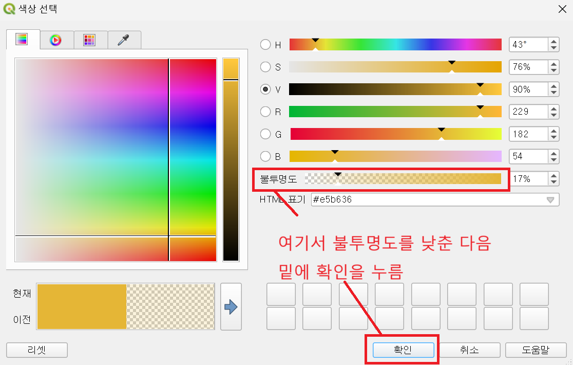 색상 선택 창에서 '확인'을 눌렀으면 마지막으로, 레이어 속성 창에서 '적용'을 누르는 것도 잊지 말자.