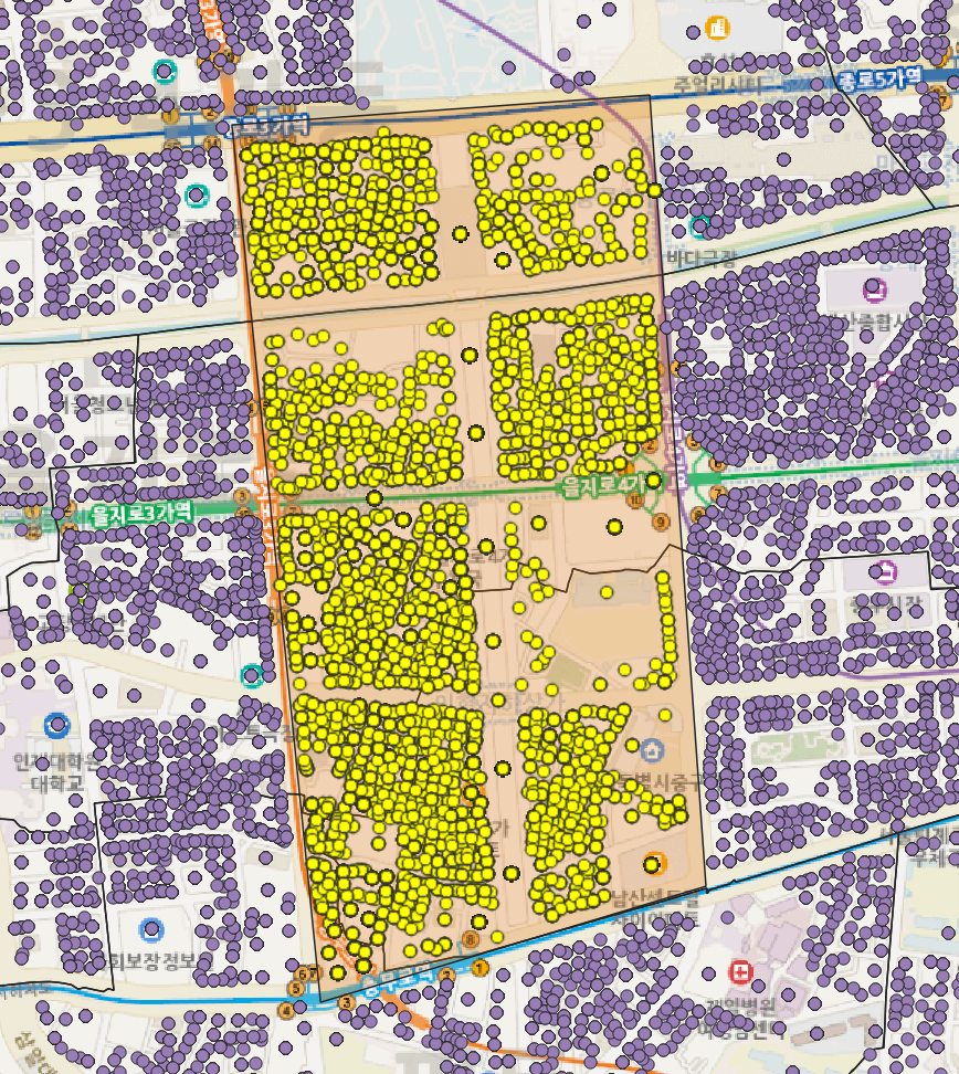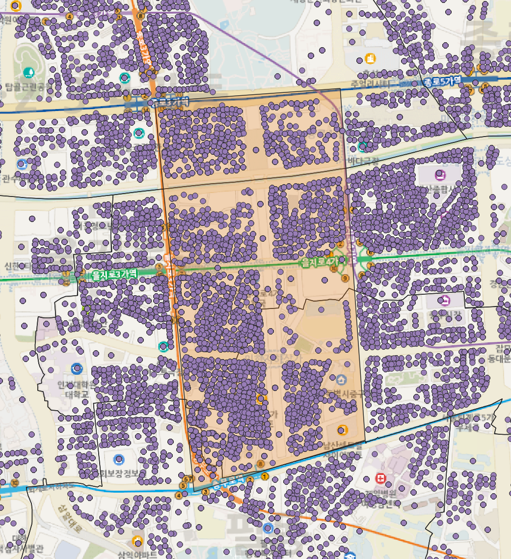 세 개의 레이어가 좌표가 정확히 맞아서 아름다운 그림을 보여준다. (맞는 좌표를 찾느라 삽질을 참 많이 했다.) 이제 다시 우리 구역을 확대해 보자. 내가 그린 사각형 안에 있는 포인트를 따로 선택해야 한다.