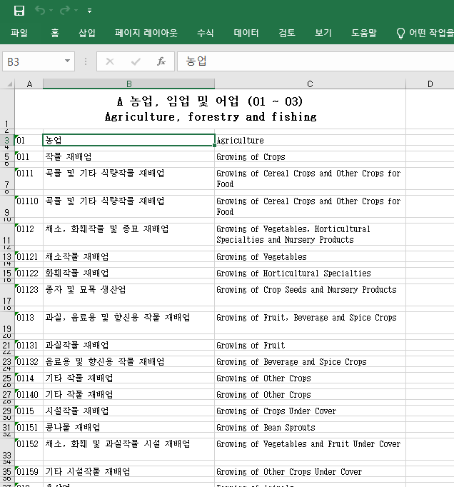 우리나라의 산업통계는 2017년부터 KSIC 10차 개정을 쓰고 있다. 그런데 2017년 이전 통계도 쓸 일이 있다 보니 9차 개정을 쓸 일이 있는데 R에서 쓸 수 있는 분류표가 없어서 따로 만들기로 했다. 통계분류포털(kssc.kostat.go.kr) 들어가서 한국표준산업분류>자료실>최신개정 들어가면 제9차 한국표준산업분류 분류항목표라는게 있고 KSIC2007.xls라는 파일을 받을 수 있다. 엑셀로 열어보면 대략 이렇다. 대-중-소-세-세세분류가 하나로 합쳐져 있다. tidy한 데이터가 없는 것이 좀 아쉽긴 한데, 그래도 이 엑셀 파일은 인쇄해서 윗사람에게 바로 보여줄 수도 있고, 약간의 가공을 거치면 R에서도 쓸 수 있으니 통계청은 상당히 효율적으로 일을 한 것이다. 이제부터 R에서 쓸 수 있는 파..